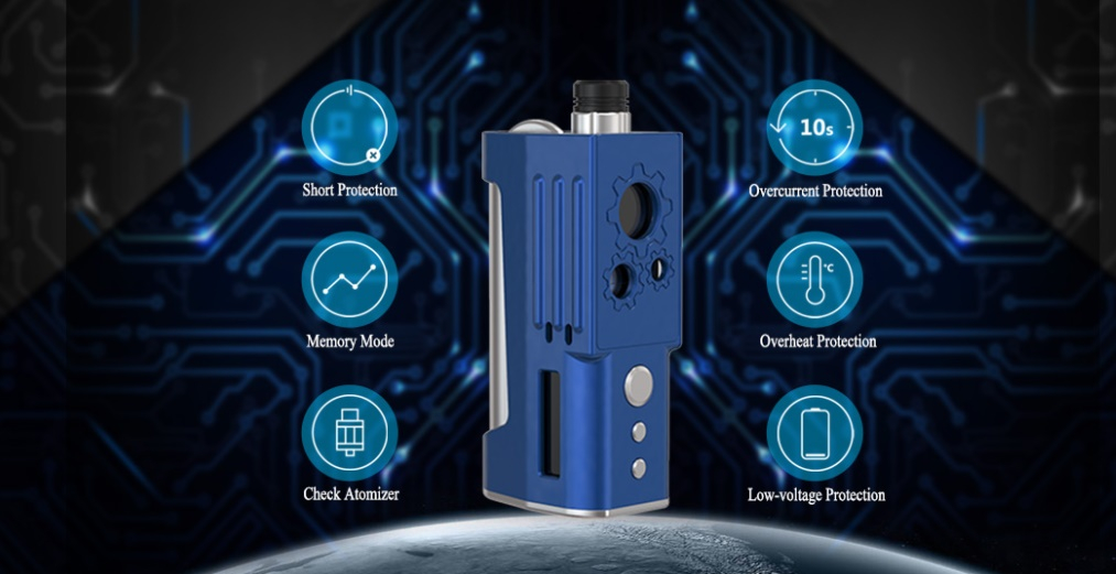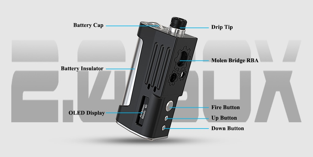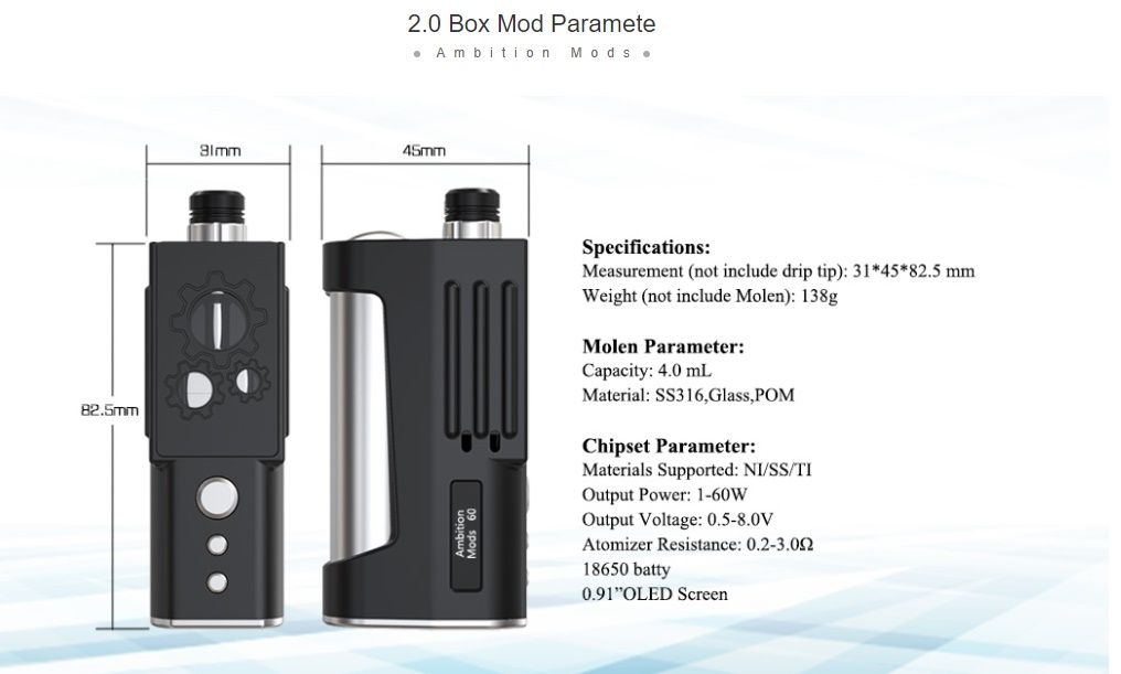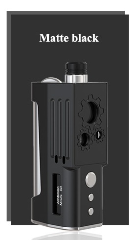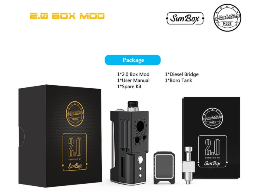 Ein weiteres Mal haben Ambition Mods und Sunbox zusammengearbeitet und dabei entstand der 2.0 Box Mod. Dieser ist ein Boro-kompatibler Mod, es passen entsprechend die verschiedensten RBAs rein, welche auch in Geräte wie der Billet Box, Delro, Boxx, usw. passten. Der Ambition Mods 2.0 Box Mod wurde bewusst so gestaltet, dass es mit 82mm x 28mm x 43m sehr kompakt blieb. Bei der Ergonomie wurde darauf geachtet, dass die Tasten zum feuern und für die Leistungsanpassung an der Frontseite immer gut erreichbar sind. Für den Betrieb des 2.0 Box Mod benötigt man 1x 18650 Akku (nicht inbegriffen), damit lässt sich eine Leistung von max. 60W abrufen.