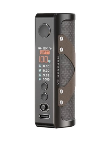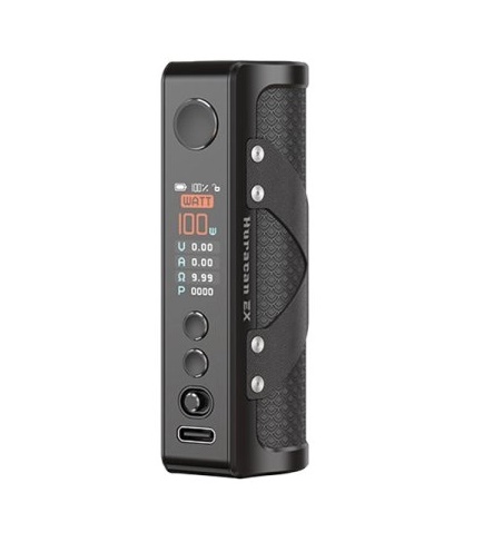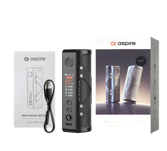 Der Aspire Huracan EX Mod ist der Nachfolger des beliebten Rhea X Mods. Der neue Huracan EX Akkuträger benötigt für den Betrieb einen 18650 Akku (nicht im Lieferumfang inbegriffen), welcher von unten her in den Akkuträger eingesetzt wird. Damit lassen sich im Watt Modus eine Leistung von bis zu 100W abrufen. Wie schon der Rhea X verfügt auch der Aspire Huracan EX über die Betriebsmodi Watt, Volt, Bypass, CPS und Temperaturkontrolle (Ni, Ti, SS). Während beim Rhea X das Design eher auf Robustheit ausgelegt war, wurde beim Huracan EX mehr Wert auf ein elegantes Design gelegt. An der Frontseite befindet sich ein 0,96" TFT Farbdisplay, welches den Nutzer jeweils mit allen wichtigen Informationen versorgt. Der Feuertaster sowie die Tasten für Plus/Minus sind dank des ergonomischen Designs jederzeit gut erreichbar an der Front platziert. Neu ist beim Huracan EX der Power Button unterhalb der Tasten für Plus und Minus. Über diesen Schieber lässt sich der Akkuträger jeweils ein- und ausschalten.
