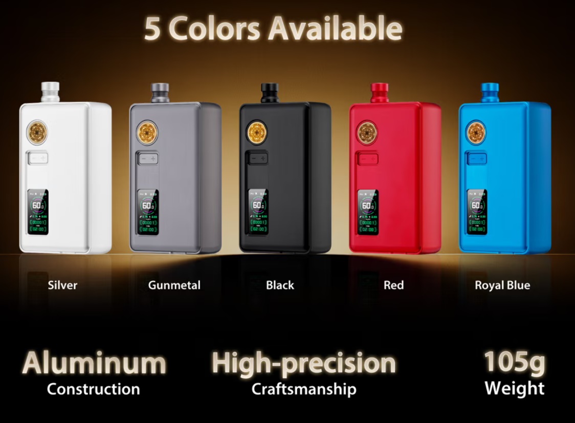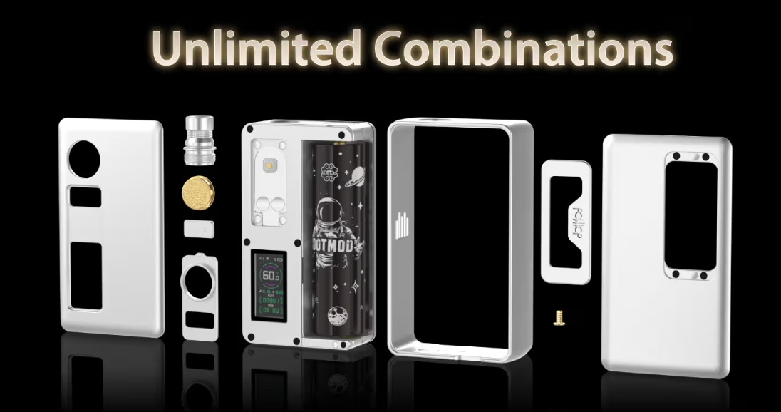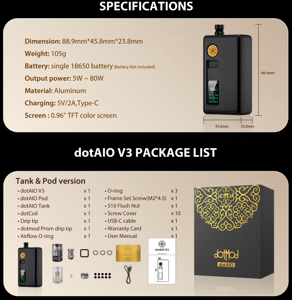 Die DotMod DotAIO V3 ist die jüngste Version der allseits beliebten DotAIO und bietet einige Neuerungen im Vergleich zu den Vorgängern. Die DotAIO V3 ist ausgelegt für die Nutzung eines 18650 Akkus (nicht inbegriffen), damit lassen sich im Power Modus bis zu 80W abrufen. In der DotAIO V3 kommt die neuste Version des hauseigenen Chips zum Einsatz, welcher nebst den bekannten Modi Auto, Power, Bypass, TC (Ni, SS, Ti), Curve und Boost nun auch die Möglichkeit bietet, um das Hintergrundbild und die Animation einfach anzupassen. An der Seite des Mods befindet sich das 0,96" TFT Farbdisplay, welches den Nutzer über die gewählten Einstellungen informiert. Das seitliche Panel verfügt zudem über Ausschnitte im Bereich des Displays und der Tasten für Plus/Minus, so dass man Änderungen auch ohne vorheriges abnehmen des Seitenteils vornehmen kann.