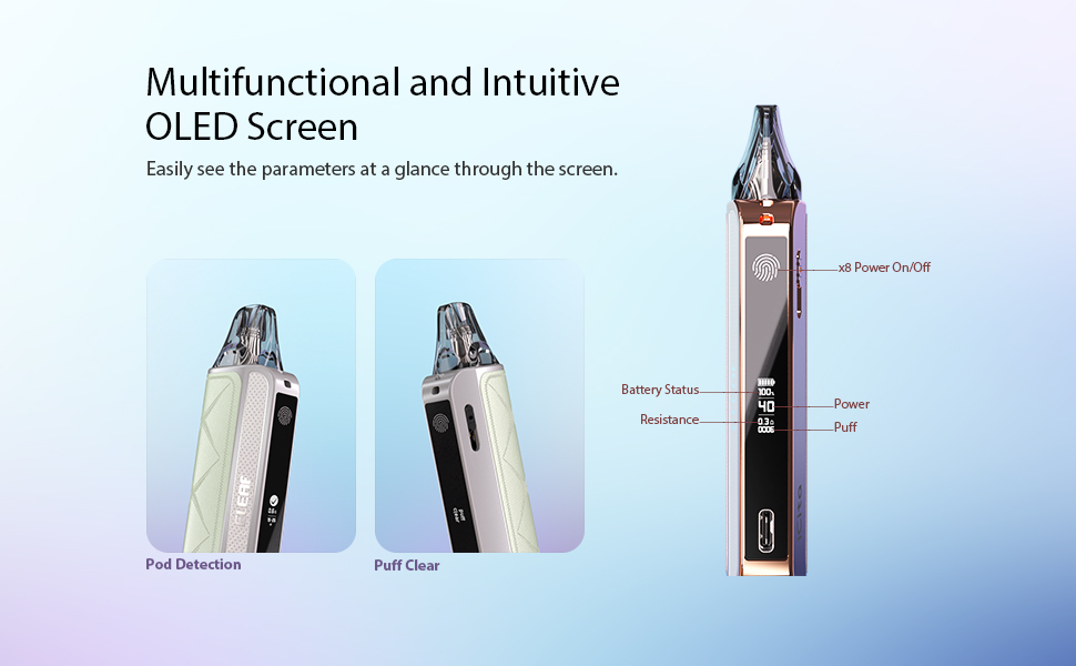 Das großzügige OLED-Display informiert Sie stets über den Akkustand, die gewählte Leistungsstufe, den Widerstand und den Puff-Counter. Mit zwei Auswahltasten und einem integrierten Navigationsbutton wird die Bedienung zum Kinderspiel.