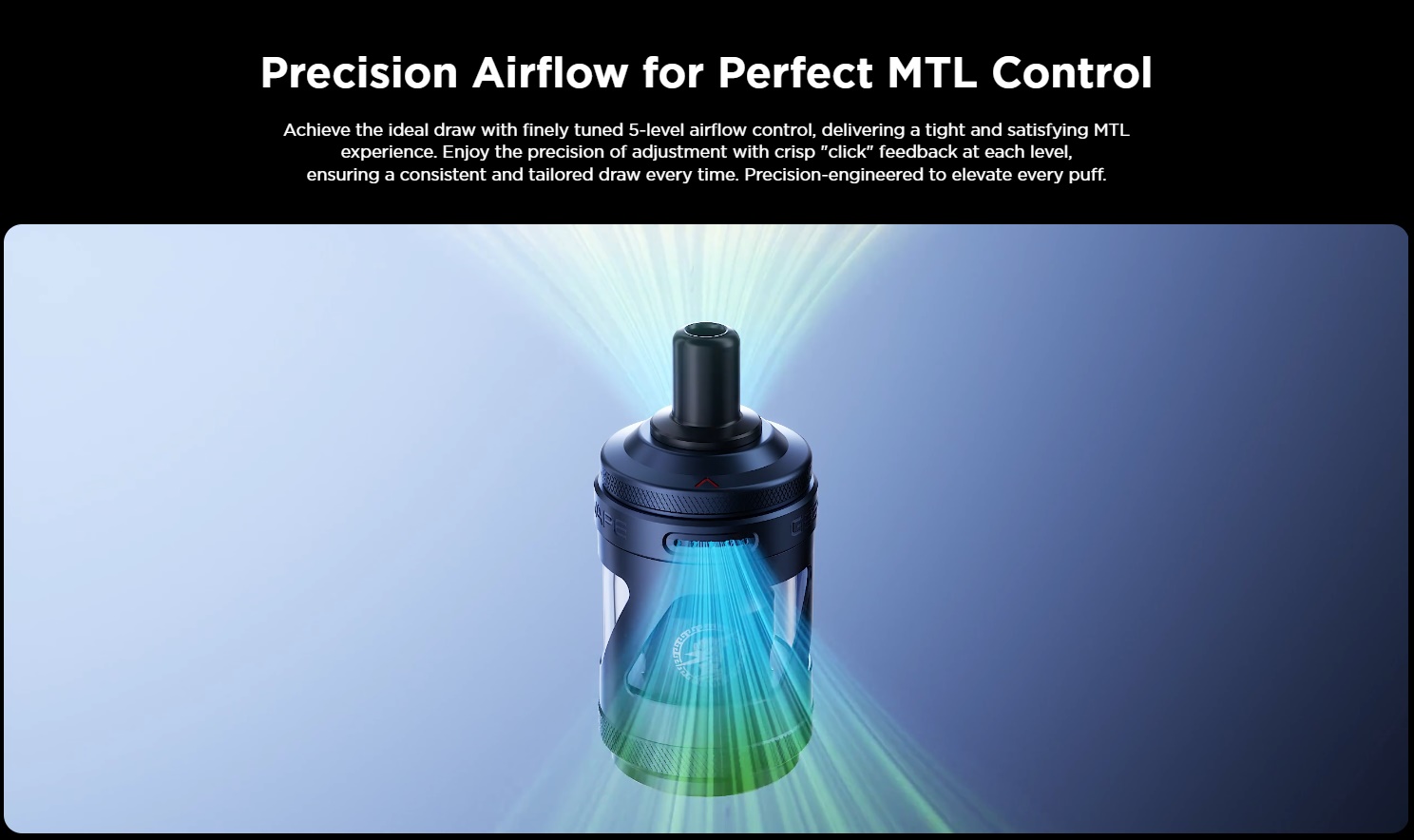 Eine Besonderheit der Z-Reihe ist ja der Top Airflow und der Z Nano MTL macht da keine Ausnahme. Der Verdampfer hat eine auf den MTL Einsatz ausgerichtete Airflow, welche sich dem eigenen Geschmack nach anpassen lässt. Dank des Top Airflows ist ein auslaufsicherer Betrieb gewährleistet.