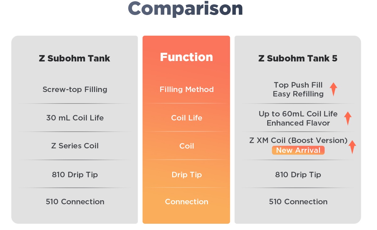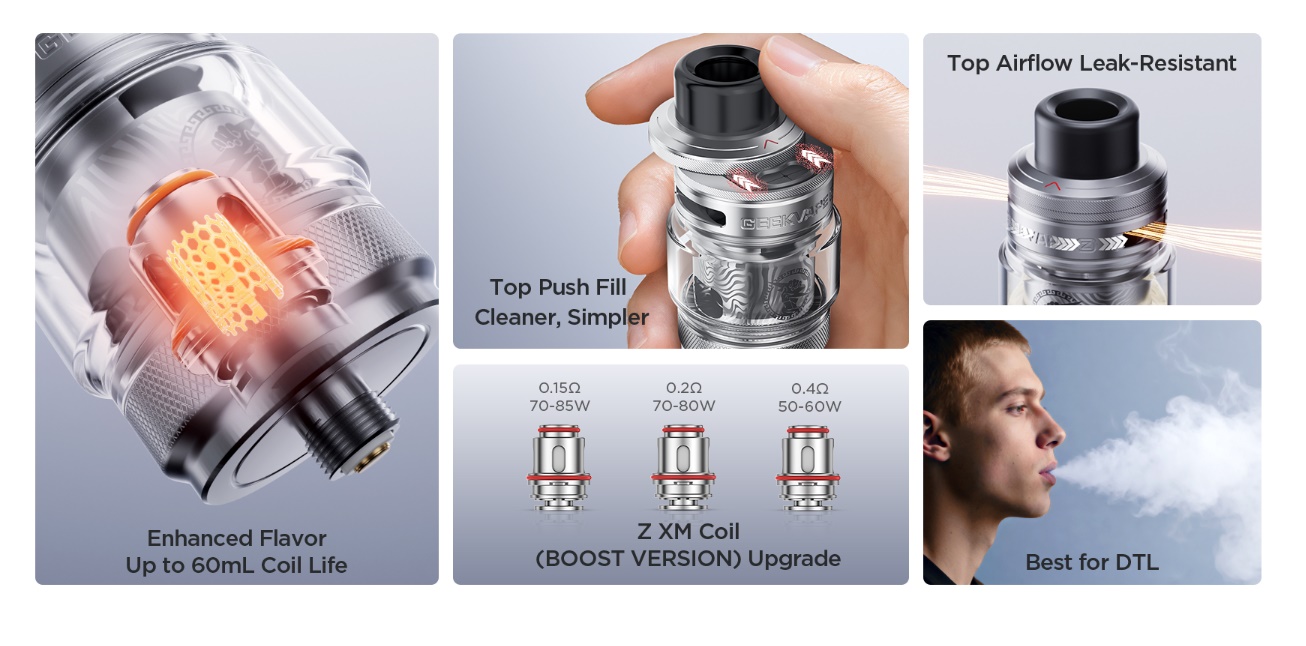 Der Geekvape Z Subohm Tank 5 ist die neuste Version des sehr beliebten Zeus Subohm Tanks. Während Geekvape das Grundkonzept des Top Airflow Tankes beibehalten hat, wurde der Z Subohm Tank 5 in Details verbessert. So besitzt der Tank nun Top zum aufschieben, um an die Füllöffnung zu gelangen. Wie schon der Vorgänger hat auch der Z Subohm Tank 5 ein Füllvolumen von 5,5ml mit dem Bubble Glass. Wie bei den Vorgängern kommen auch beim neusten Z Subohm Tank die bekannten Z-Coils zum Einsatz.