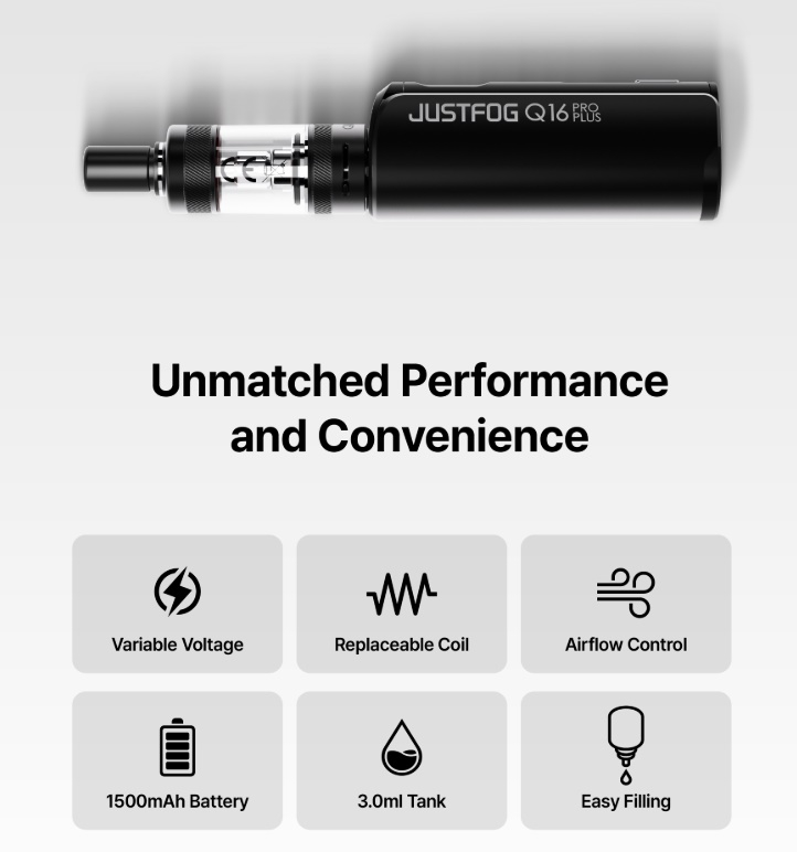 Neu am Tank des Q16 Pro Plus ist auch sein Füllvolumen. Hatten die Vorgänger noch jeweils knapp 2ml an Tankkapazität, so hat Justfog diese beim Q16 Pro Plus auf 3ml erweitert. Als Coils kommen beim Justfog Q16 Pro Plus die bewährten Q16 1,2 Ohm und 1,6 Ohm Coils zum Einsatz. Der Q16 Pro Plus bietet 4 Leistungsstufen, die über den Taster einstellbar sind. Damit lässt sich die Spannung von 3,5V bis 4,4V einstellen. An der Oberseite des Akkuträgers befindet sich der LED Indikator, welcher gut ersichtlich über den Akkuzustand informiert.