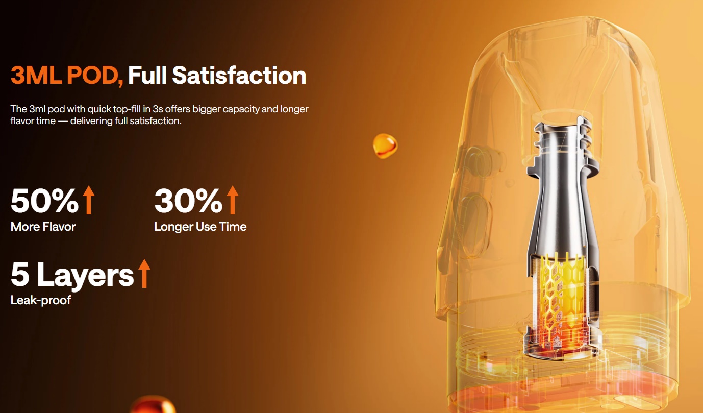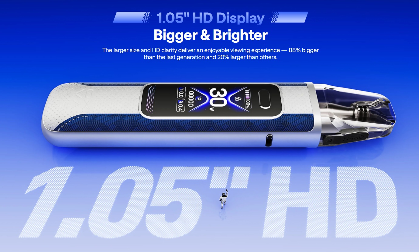 Das 1.05 Zoll HD Farbdisplay liefert gestochen scharfe Informationen zu Leistung, Akkustand, Widerstand, Zugdauer und Puff-Counter. Ein zusätzlicher RGB LED-Strip unterhalb des Displays sorgt bei jedem Zug für visuelle Akzente und lässt sich individuell anpassen. Über einen seitlichen Slider lässt sich der Luftstrom exakt einstellen – von strengem MTL bis zu offenem RDL. Die magnetisch fixierten Pods bleiben dabei fest und sicher im Gerät.