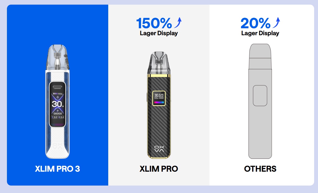 Der neue PHOTON Chip sorgt für eine konstante Dampfleistung, auch bei niedrigem Akkustand. Im Smart-VW Modus erkennt das Gerät automatisch den eingesetzten Pod und wählt eine optimale Leistung – individuell anpassbar im sicheren Bereich, ohne die Coil zu überlasten. Die maximale Ausgangsleistung beträgt 30 WattDas Xlim Pro 3 Kit lässt sich wahlweise per Zugautomatik oder per multifunktionalem Fire-Button bedienen. Mit einfachen Klick-Kombinationen können Leistung, Sperrstatus und Displayoptionen direkt am Gerät eingestellt werden – intuitiv und effizient.