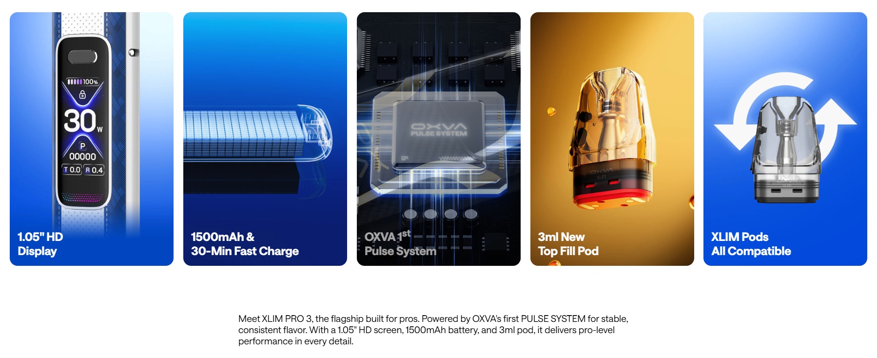 Mit dem OXVA Xlim Pro 3 Kit bringt der Hersteller eine rundum überarbeitete Version seines beliebten Pod-Systems auf den Markt. Das ergonomische Stick-Design, das brillante 1.05 Zoll HD-Farbdisplay und der moderne PHOTON Chipsatz machen das handliche Kit zu einem idealen Begleiter für intensives MTL- und RDL-Dampfen – sowohl für Einsteiger als auch für erfahrene Dampfer. Im Inneren des kompakten Gehäuses sorgt ein integrierter 1500 mAh Akku für eine beeindruckende Ausdauer. Dank USB-C Fast-Charging (5V/2A) ist das Gerät innerhalb von ca. 30 Minuten zu 80 % wieder aufgeladen (Herstellerangabe). Perfekt für unterwegs!