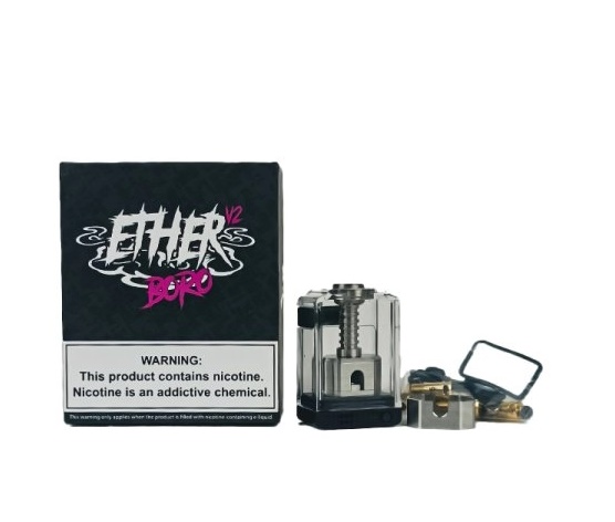 Das Suicide Mods Ether V2 Boro Kit ist der Nachfolger des Ether Boro RBA Kits. Die Ether V2 RBA wurde wiederum mit dem YouTube Reviewer The Vaping Bogan entwickelt und bekam einige signifikante Änderungen spendiert. Die Suicide Mods Ether V2 RBA orientiert sich mehr am Design anderer bekannter RBAs und bekam ein neu konzipiertes Deck spendiert. Das Deck nimmt zwar immer noch Single Coils auf, jedoch wird die Watte nun nicht mehr in Taschen seitlich des Decks platziert, sondern durch Öffnungen im Sleeve nach aussen geführt. Dadurch ist es noch einfacher geworden, um die RBA zu wickeln. Die RBA besteht nun aus 4 Teilen: dem Deck, dem Barrel, dem Top Cap und dem Kamin. Der Barrel liegt der RBA in 2 Versionen bei, einer mit Öffnungen für 3mm Watte und einer mit Öffnungen für 2,5mm Watte. Zudem gibt es ein separat erwerbbares Barrel Kit in 6 verschiedenen Farben, so dass man die Ether V2 auch noch farblich anpassen kann Die Airflow Pins lassen sich wie beim Vorgänger einfach von unten her auswechseln und werden mit Luftlöchern von 1mm bis 4mm mitgeliefert. Im Gegensatz zur ersten Version der Ether RBA, benötigt die Suicide Mods Ether V2 keinen Adapter mehr zum ausglühen der Coil, da das Deck selbst über ein 510 Gewinde verfügt.