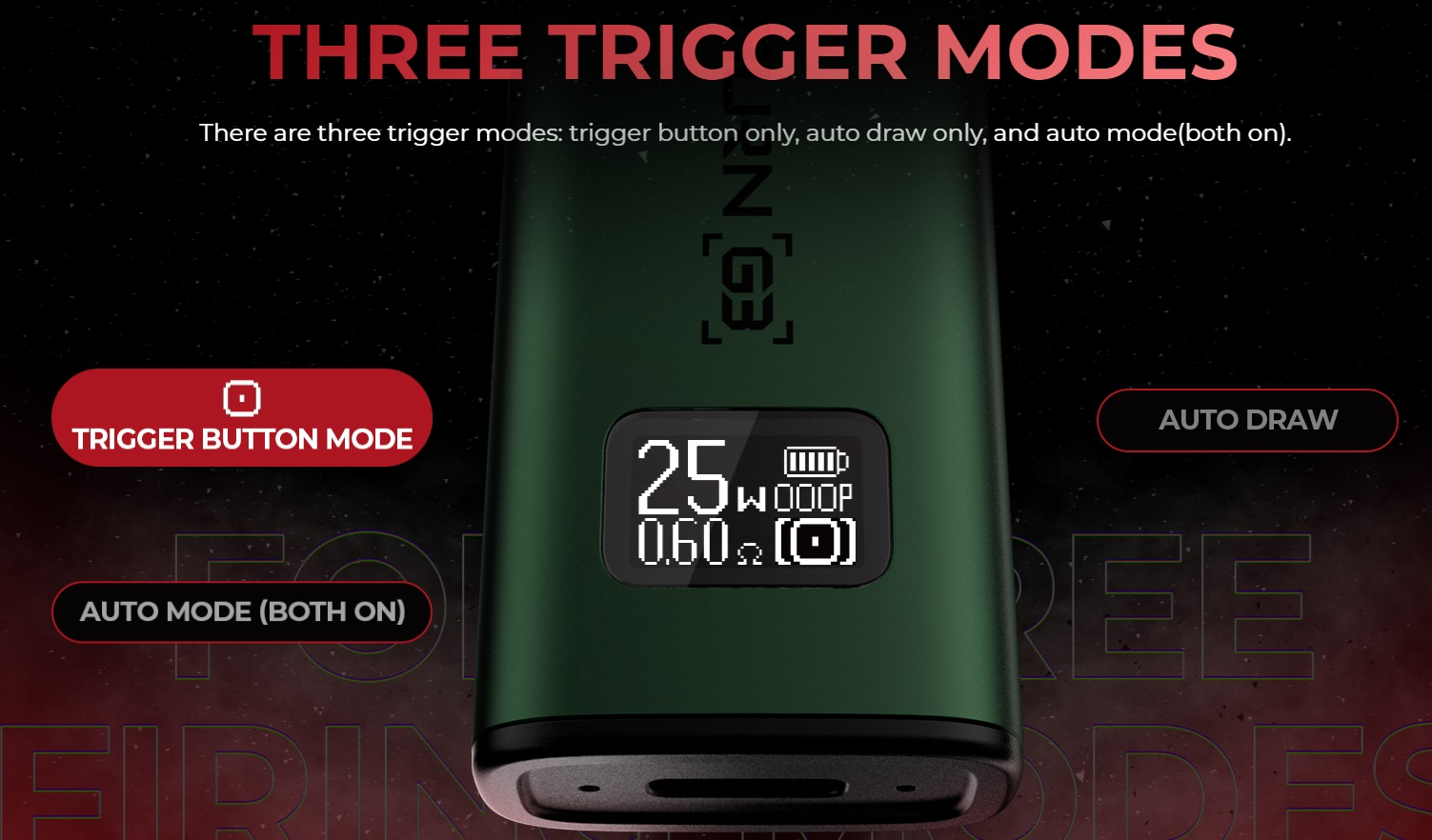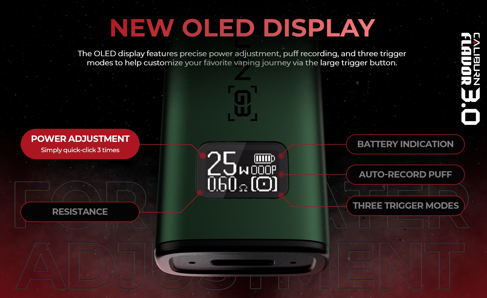 An der Frontseite befindet sich das OLED Display, welches den Nutzer über die festgelegte Leistung, die Anzahl Züge und den Akkustand informiert. Im Gegensatz zu den alten Caliburn G und G2 lässt sich die Leistungsabgabe beim Caliburn G3 einstellen. Dies ist jedoch nicht zwingend nötig, da die Leistung beim einstecken des Pods gleich auf den optimalen Wert eingestellt wird. Eine Neuerung ist auch die dreifache Sperrfunktion. Wie schon beim Caliburn X lässt sich auch beim Caliburn G3 der Feuertaster sperren und dann nur die Zugautomatik nutzen. Man kann aber auch die Zugautomatik sperren und den Feuertaster nutzen oder auch beide Funktionen entsperren. Dies erreicht man durch zweimaliges drücken des Feuertasters. Drückt man den Taster 3x, lässt sich die Leistung entsprechend des eingesetzten Pods einstellen.