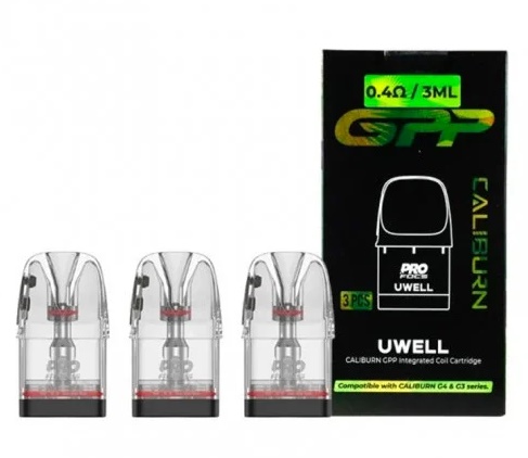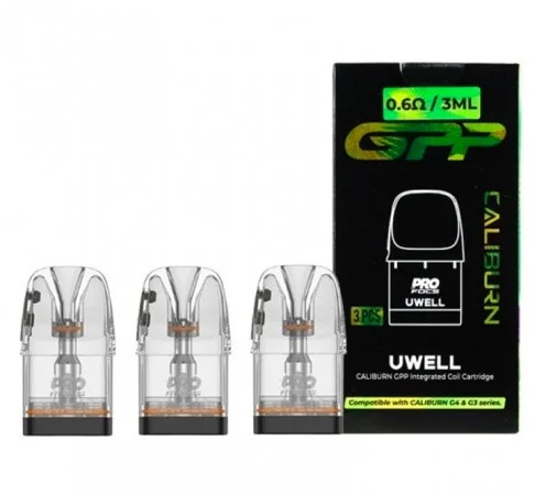Die neuen Uwell Caliburn GPP Pods eignen sich sowohl für die Caliburn G3 als auch die Caliburn G4 Reihe. Die GPP Pods besitzen nun ein Füllvolumen von 3ml und werden an der Seite des Mundstückes befüllt. Wie schon bei den alten Caliburn G3 Pods gibt es die Uwell Caliburn GPP Pods in den Widerständen 0,4 Ohm, 0,6 Ohm oder 0,9 Ohm. Geliefert werden sie jeweils zu 3 Stück pro Packung.