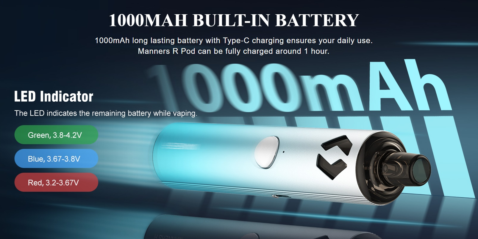 Der Vapefly Manners R Pod Mod ist der jüngste Spross in der Manners-Familie. Im Gegensatz zum Manners 2 setzt Vapefly beim Manners R auf eine Stick-Form. Der festverbaute Akku hat eine Kapazität von 1000mAh und lässt sich über den USB Type-C Anschluss an der Unterseite laden. Der Pod wird beim Vapefly Manners R durch Magnete in Position gehalten und da der Pod im Gerät versenkt ist, wackelt er auch nicht so sehr. Dank des seitlichen Füllloches lässt sich der 3ml fassende Pod einfach und schnell jeweils befüllen.