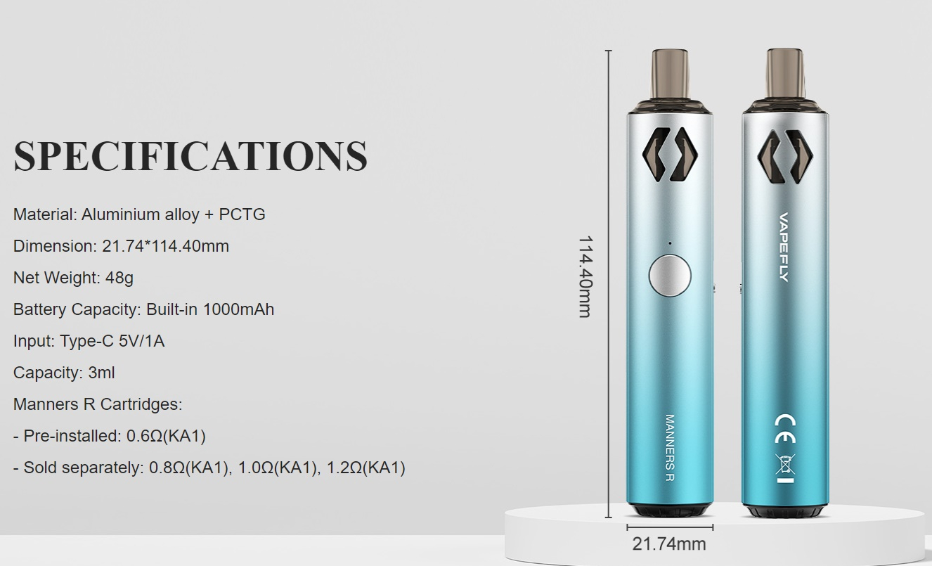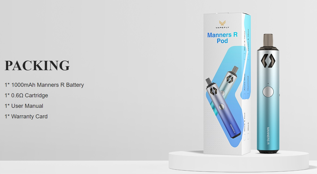 Vapefly bietet für den Manners R Pods mit 4 verschiedenen Widerständen an: 0,6 Ohm, 0,8 Ohm, 1,0 Ohm und 1,2 Ohm. Dadurch lässt sich der Pod Mod ganz der eigenen Dampfvorliebe nach anpassen. Der Vapefly Manners R verfügt über einen Feuertaster und eine Zugautomatik, wobei sich der Feuertaster auch sperren lässt und dann nur die Zugautomatik aktiv ist. An der Seite des Gerätes befindet sich ein Slider zum einstellen des Zugwiderstandes.