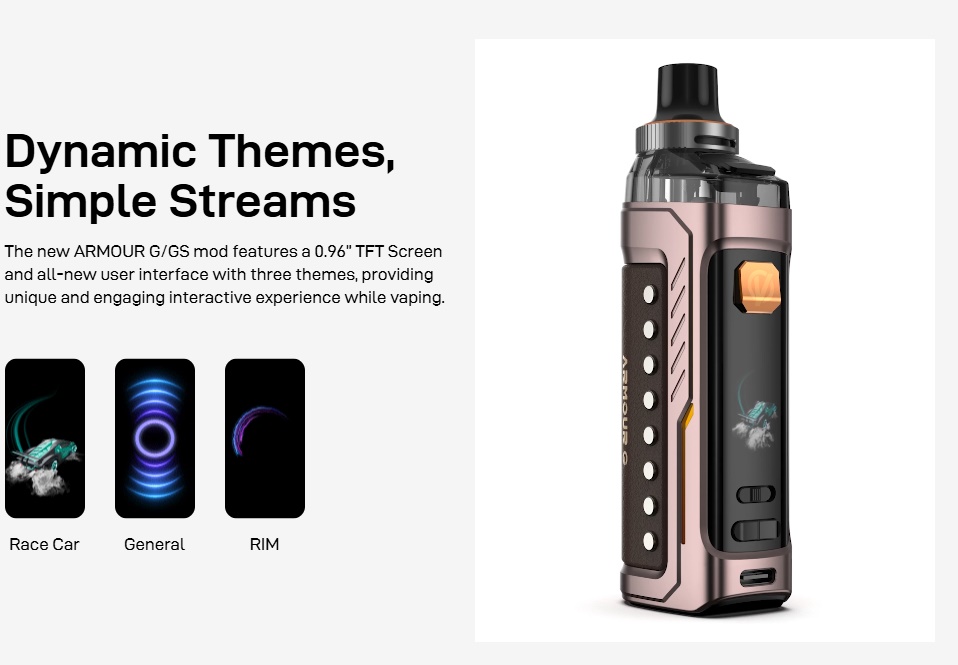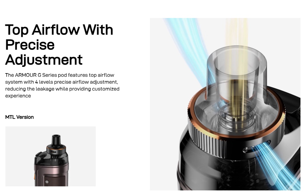 Der Vaporesso Armour G ist ein Pod Mod, welcher sich sowohl an DL als auch MTL Dampfer richtet. Trotz seiner kompakten Masse ist im Armour G ein Akku mit 3000mAh verbaut, welcher über den USB Type-C Anschluss geladen wird. Der Pod des Vaporesso Armour G fasst stolze 5ml Liquid und ist dank der Befüllöffnung an der Oberseite bequem wieder zu befüllen. Am Pod befindet sich auch die Airflow Control, über welche der Zugwiderstand eingestellt werden kann. Der mitgelieferte Pod eignet sich für MTL bis RDL, mit dem optional erhältlichen DTL Pod kann der Armour G aber auch für DL genutzt werden.