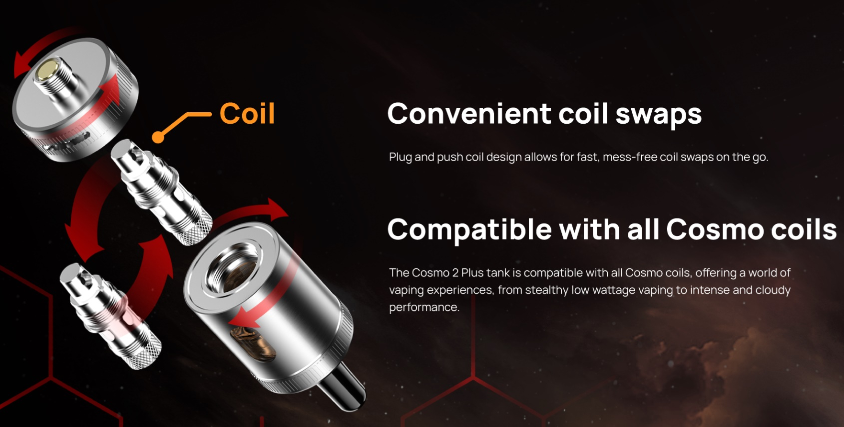 Der Vaptio Cosmo 2 Plus Verdampfer mit 510er Anschluss verfügt über ein Füllvolumen von 3ml. Befüllt wird der Tank bequem und sauber von oben (Topfill) durch eine Vierteldrehung des Deckels (Bajonettverschluss). Mit dem stufenlos regulierbaren Luftzugeinstellungsring am Tankboden lässt sich das Zugverhalten nach beliegen einstellen. Auch das standart 510er Mundstück kann bei Bedarf gegen ein anderes ausgetauscht werden. Im Set enthalten sind zwei verschiedene Fertigcoils / Verdampferköpfe. 1 x Vaptio Cosmo C5 Verdampferkopf mit 1.0 Ohm und 1 x Vaptio Cosmo C6 Verdampferkopf mit 0.7 Ohm. Was ein grosser Vorteil ist, dass die beliebten Aspire Nautilus Coils auch in den Verdampfer-Tank passen (ausser den 0,7 Ohm und 1,0 Ohm Mesh, die sind leicht zu lange und passen deshalb nicht). Somit gibt es eine tolle Auswahl an Coil-Widerständen. Natürlich können Sie den Cosmo 2 Verdampfer dank dem genormten 510er Verdampferanschluss auch auf andere Akkuträger mit Platz für einen 22 mm Verdampfer aufschrauben und dort verwenden.