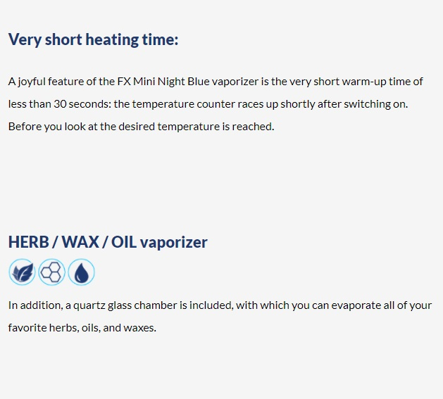 Der Wolkenkraft FX Mini nutzt die True Concection Erhitzungstechnologie, welche sehr effizient arbeitet. Der Vaporizer heizt sich innert 30s auf die zuvor festgelegte Temperatur auf, wobei diese präzise im Bereich von 160°C bis 221°C eingestellt werden kann. Und dank des Mundstückes aus Pyrex erhält man einen unverfälschten Geschmack beim verdampfen.