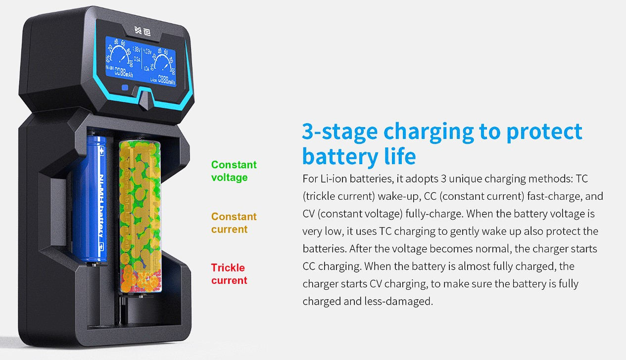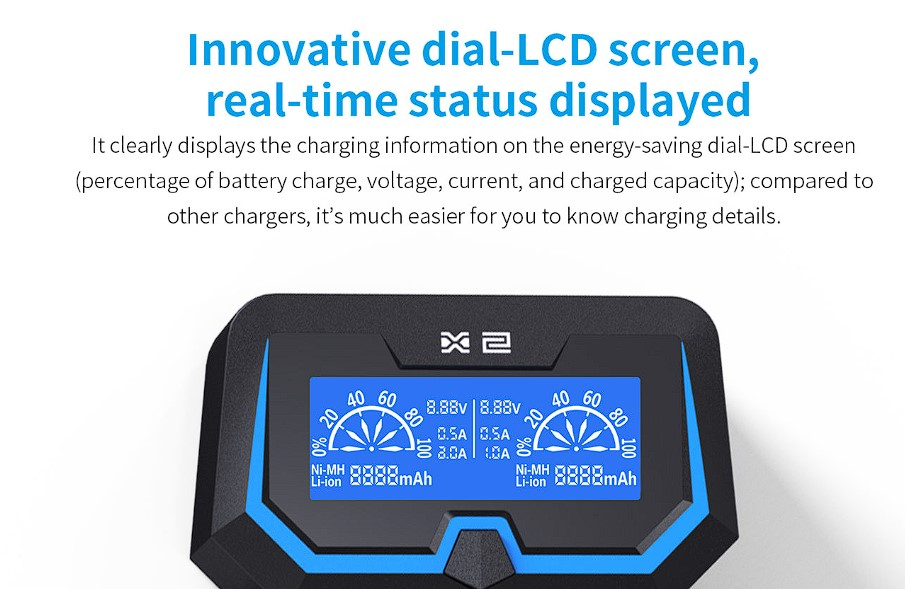 Das Xtar X2 verfügt über ein grosses und klares Display, welches jederzeit mit Daten in Echtzeit informiert, wobei jeder der beiden Ladeschächt eigenständig und unabhängig voneinander überwacht werden. Natürlich verfügt das Ladegerät auch über alle nötigen Schutzschaltungen, so dass ein sicherer Betrieb gewährleistet werden kann.