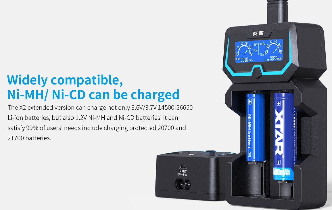 Das Xtar X2 ist ein modernes Akkuladegerät, welches für den Betrieb mit 110V bis 240V ausgelegt ist. Es verfügt zusätzlich noch über einen USB Eingang, so dass man das Ladegerät auch auf Reisen nutzen kann. Das Xtar X2 verfügt über 2 Ladeschächte, in welchen eine Vielzahl von Akkugrössen geladen werden können. Das Ladegerät verfügt über eine smarte Ladestromeinstellung, so dass man sich nicht erst noch mit unzähligen Einstellungen rumschlagen muss.