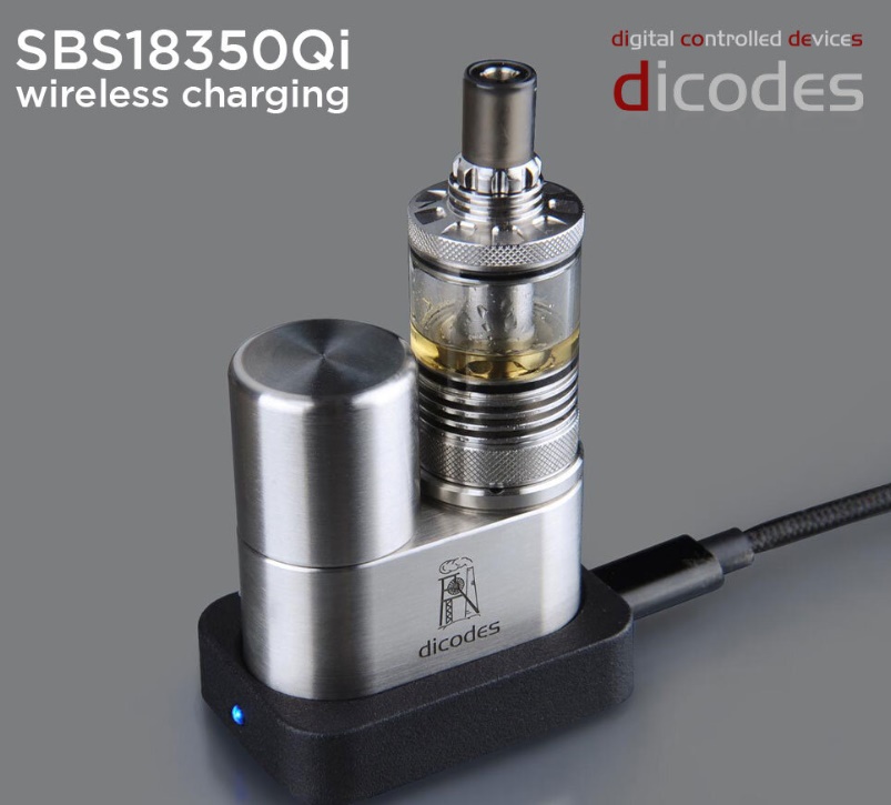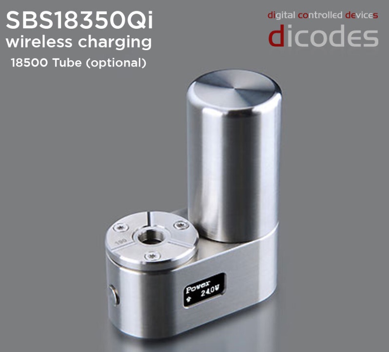 Die Dicodes Dani SBS18350Qi ist wohl eine der kompaktesten Side-by-Side Mods auf dem Markt. Die Dani SBS18350Qi ist ausgelegt für die Nutzung von 1x 18350 Akku (nicht inbegriffen), optional gibt es aber auch noch Akkuhülsen für 18500 oder 18650. Somit lässt sich die Optik entsprechend der Länge des Verdampfers anpassen. Die Dani SBS18350Qi wird über eine Taste bedient, den Feuertaster. Wie schon bei der Extreme V3 kommt auch bei der SBS18350Qi das Single-Button Setup Prinzip zum tragen. Eine Besonderheit der Dicodes Dani SBS18350Qi ist sicher die Möglichkeit den Akku kabellos laden zu können. Entsprechend liefert Dicodes auch gleich ein passendes Ladegerät mit.