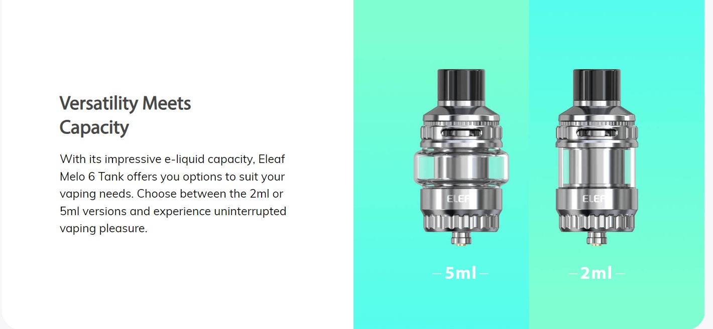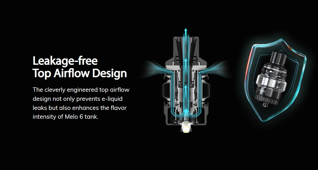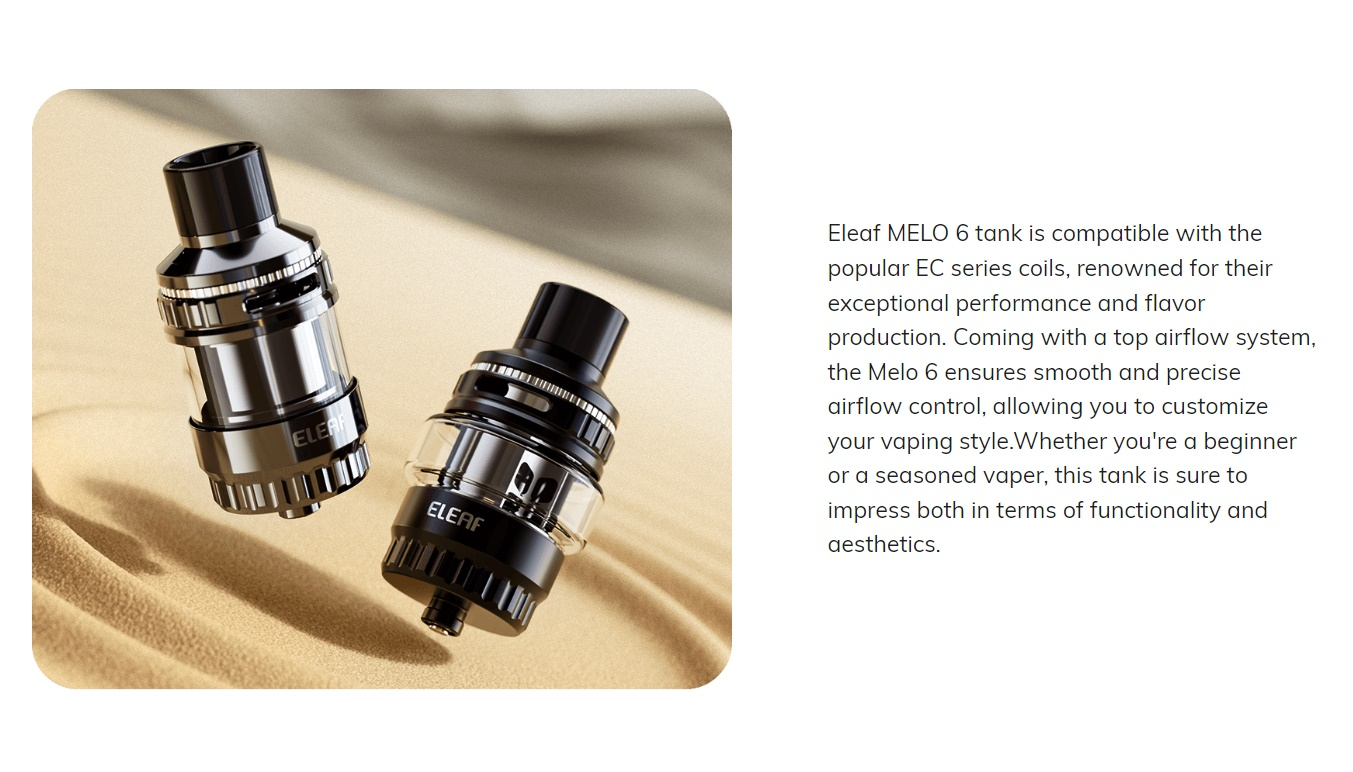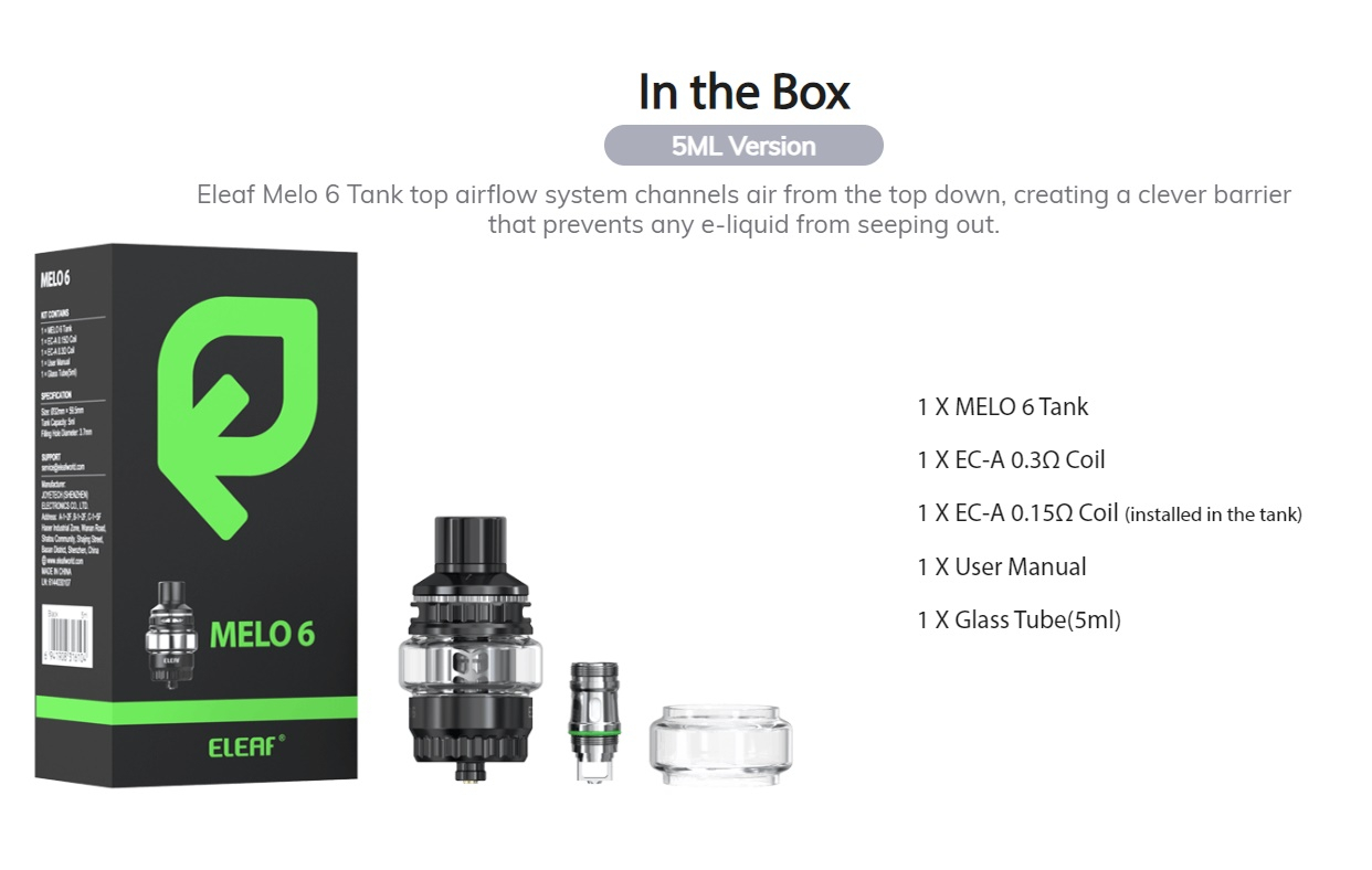 Ein weiteres Highlight des Melo 6 Verdampfers ist sein ausgeklügeltes Airflow-System. Der Verdampfer besitzt ein stufenlos einstellbares Top Airflow System, dadurch ist das Risiko eines auslaufenden Tankes viel geringer. Der Melo 6 Verdampfer ist mit den beliebten Eleaf EC Coils kompatibel. Im Lieferumfang erhalten Sie einen EC-A Coil mit einem Widerstand von 0.3 Ohm und einen Coil mit einem Widerstand von 0.15 Ohm, der bereits im Tank verbaut ist. Der Melo 6 Verdampfer von Eleaf ist für DL-Dampfer konzipiert und mit seinem grosszügigen Tank, dem benutzerfreundlichen Design und der beeindruckenden Dampf- und Geschmacksproduktion ist er eine ausgezeichnete Wahl für jeden anspruchsvollen Dampfer.