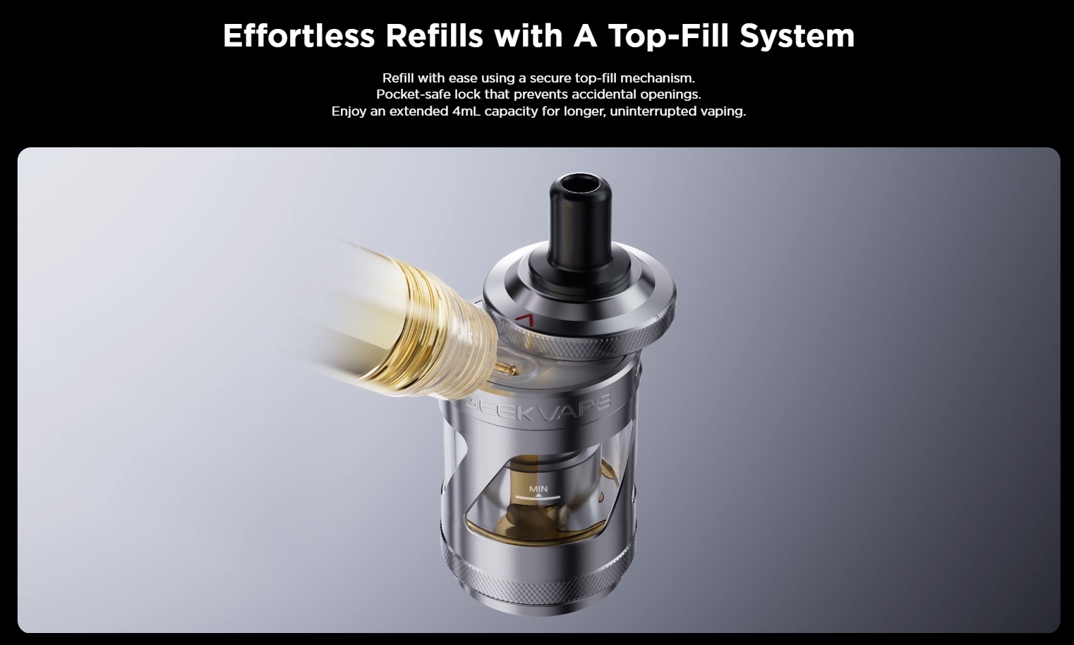 Eine Besonderheit der Z-Reihe ist ja der Top Airflow und der Z Nano MTL macht da keine Ausnahme. Der Verdampfer hat eine auf den MTL Einsatz ausgerichtete Airflow, welche sich dem eigenen Geschmack nach anpassen lässt. Dank des Top Airflows ist ein auslaufsicherer Betrieb gewährleistet.