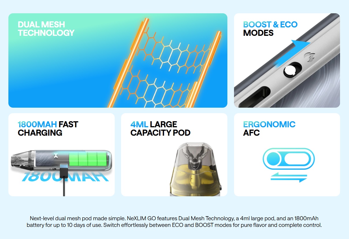 Der Oxva NeXlim Go ist die vereinfachte Version des NeXlim Podsystems von Oxva. Der NeXlim Go richtet sich ganz klar an jene Dampfer, welche auf ein Display und unzählige Einstelloptionen verzichten können und dafür lieber mehr Akku haben. Denn der Oxva NeXlim Go besitzt einen Akku mit 1800mAh, welcher über den USB Type-C an der Seite geladen werden kann. Im NeXlim Go kommen die gleichen Dual-Mesh Pods mit 4ml Füllvolumen zum Einsatz wie schon beim NeXlim.