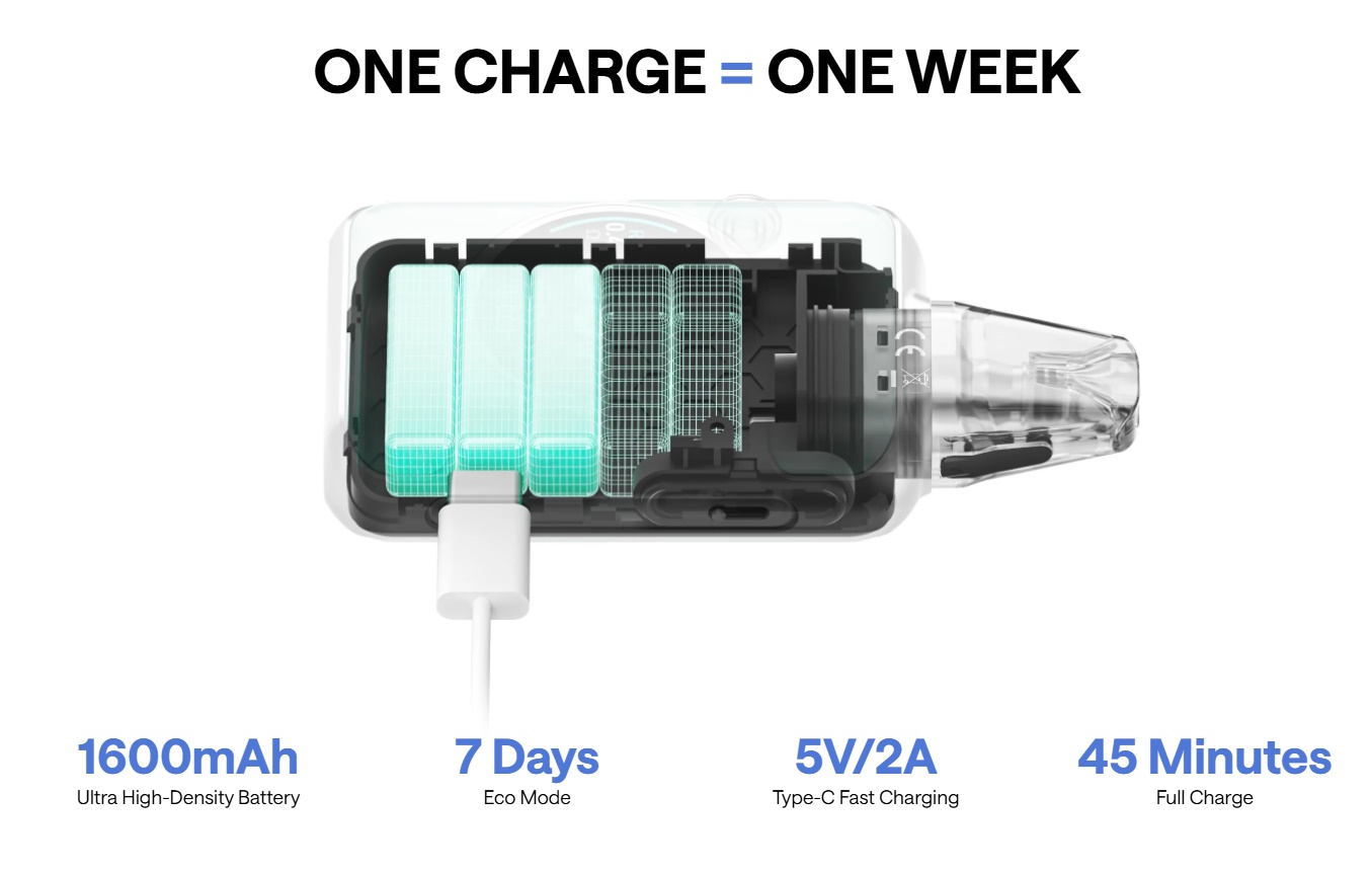 Der Oxva Xlim SQ Pro 2 besitzt einen Akku mit 1600mAh und wird über den USB Type-C mit 2A/5V geladen. An der Seite des Xlim SQ Pro 2 befindet sich die Taste zum aktivieren des Displays und zum ein-/ausschalten. An der anderen Seite befindet sich der Schieber für den Zugwiderstand. Der Oxva Xlim SQ Pro 2 kann alle Xlim Pods (Xlim Pod V2, Xlim Pod V3, Xlim Pod EZ) aufnehmen.