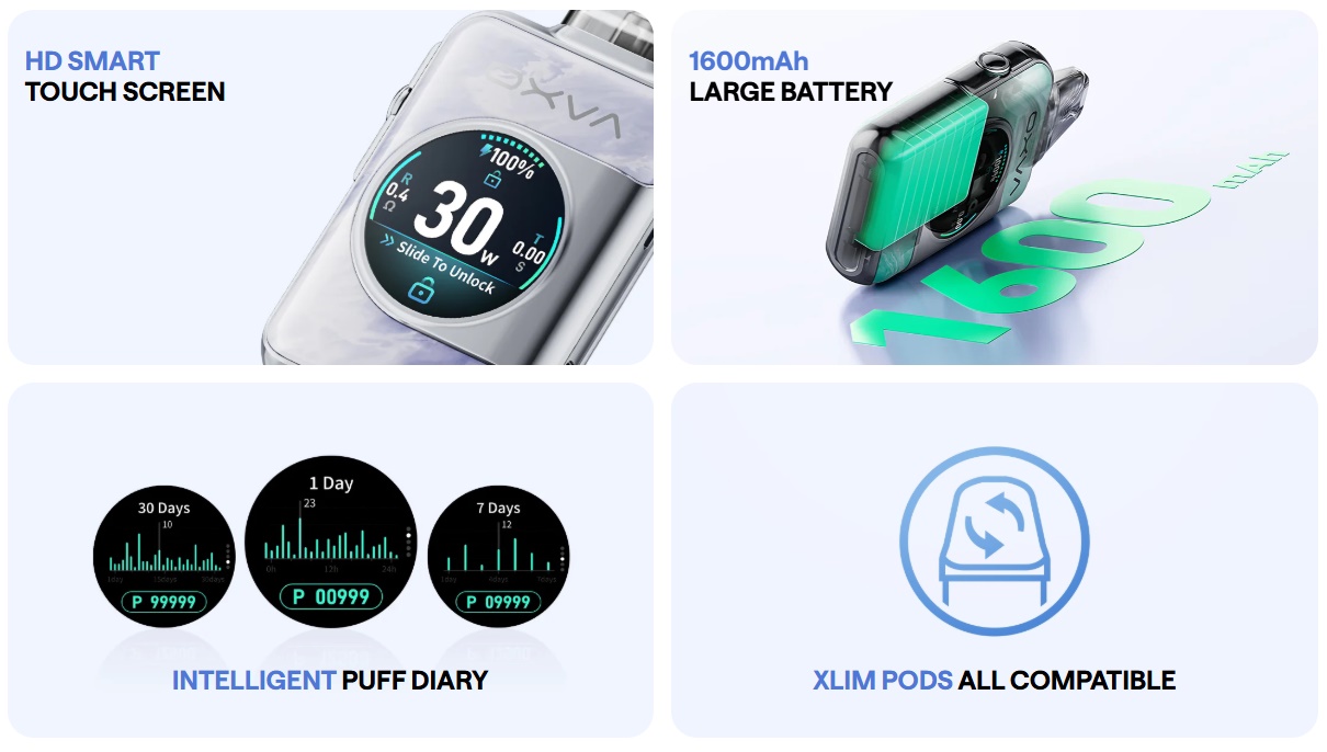 Der Oxva Xlim SQ Pro 2 ist der Nachfolger des beliebten Xlim SQ, welcher durch sein kompaktes Format und dem grossen Akku zu überzeugen wusste. Der Xlim SQ Pro 2 ist dabei nicht einfach nur ein simples Upgrade, Oxva spendiert dem SQ Pro 2 einige neue Features. Das wohl auffälligste Feature ist das 1,09" grosse Touchdisplay, welches in 316PPI mit 60Hz auflöst. Dadurch ist das Display sehr zügig ansprechbar und lässt sich einfach bedienen. Ein weiteres Feature ist der Puff Counter, welcher nicht einfach nur alle Züge darstellt, sondern man jetzt sehen kann wieviele Züge man am Tag, in 7 Tagen, in 30 Tagen und im Gesamten gemacht hat.