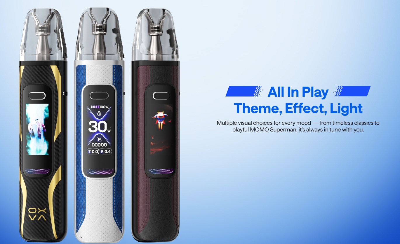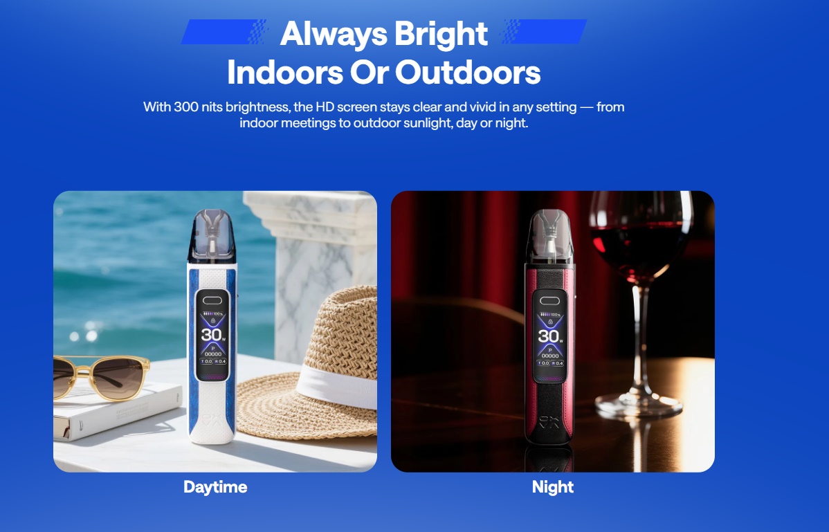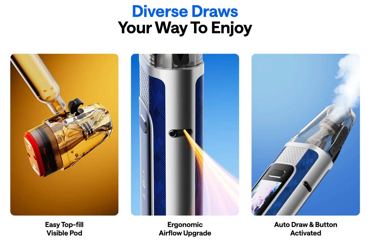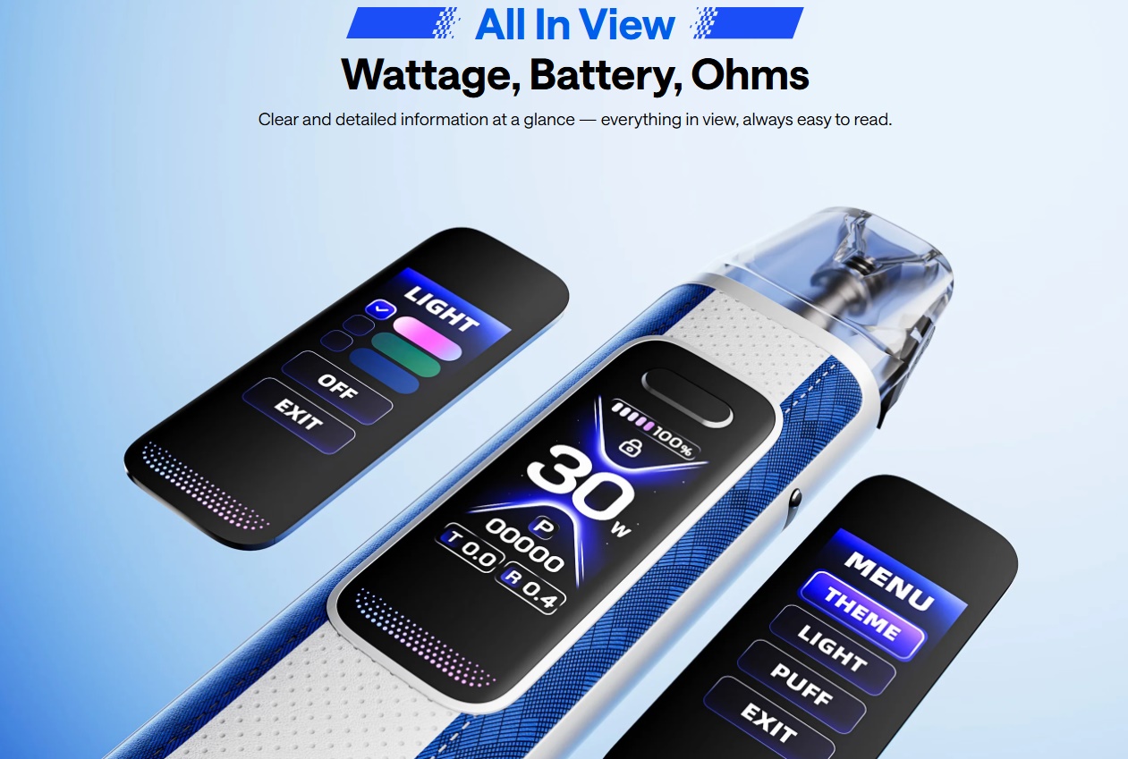 Das 1.05 Zoll HD Farbdisplay liefert gestochen scharfe Informationen zu Leistung, Akkustand, Widerstand, Zugdauer und Puff-Counter. Ein zusätzlicher RGB LED-Strip unterhalb des Displays sorgt bei jedem Zug für visuelle Akzente und lässt sich individuell anpassen. Über einen seitlichen Slider lässt sich der Luftstrom exakt einstellen – von strengem MTL bis zu offenem RDL. Die magnetisch fixierten Pods bleiben dabei fest und sicher im Gerät.