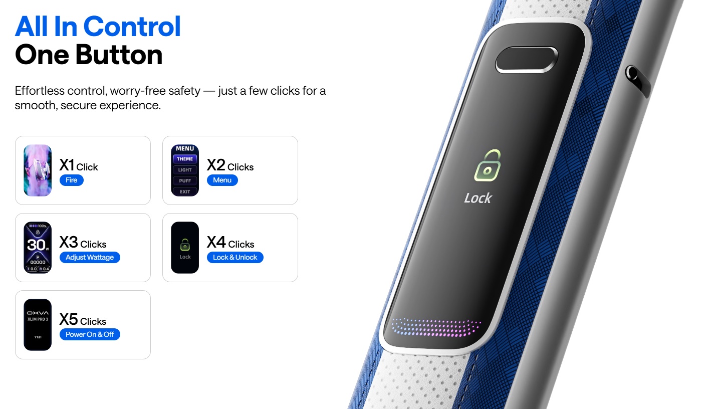 Der neue PHOTON Chip sorgt für eine konstante Dampfleistung, auch bei niedrigem Akkustand. Im Smart-VW Modus erkennt das Gerät automatisch den eingesetzten Pod und wählt eine optimale Leistung – individuell anpassbar im sicheren Bereich, ohne die Coil zu überlasten. Die maximale Ausgangsleistung beträgt 30 WattDas Xlim Pro 3 Kit lässt sich wahlweise per Zugautomatik oder per multifunktionalem Fire-Button bedienen. Mit einfachen Klick-Kombinationen können Leistung, Sperrstatus und Displayoptionen direkt am Gerät eingestellt werden – intuitiv und effizient.