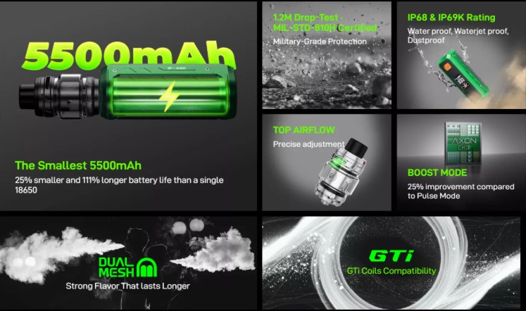 Der integrierte Hochleistungsakku der Vaporesso Armour Ultra entspricht zwei 18650 Akkus und liefert ausdauerndes Dampfen für intensive Sessions. Ideal für Cloud-Chaser und Langzeitnutzer, die ein Gerät brauchen, das mit ihrem Tempo mithält.Beständig gegen alle Bedingungen – Militärtauglich